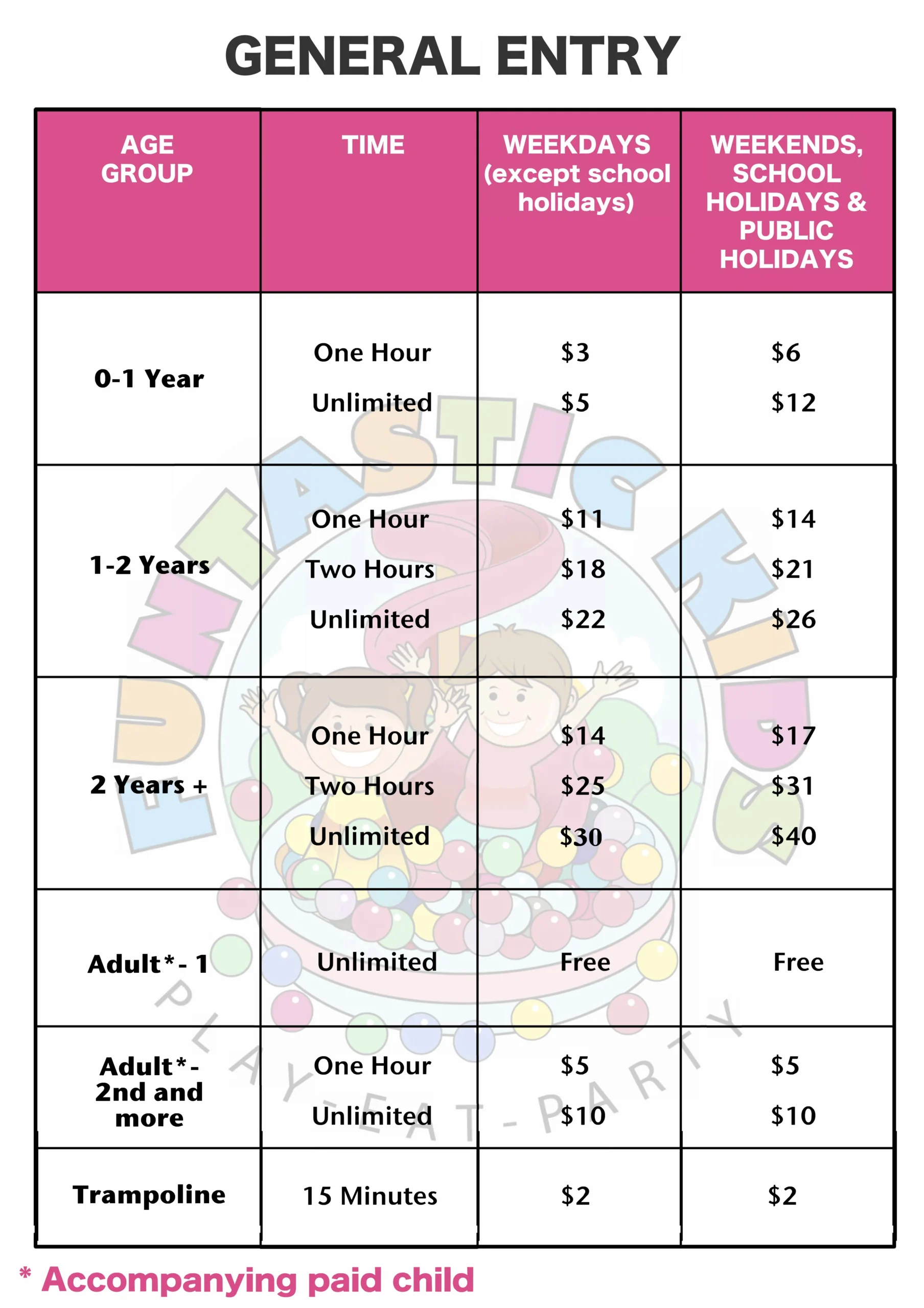 Adults are encouraged to supervise, monitor and support children to encourage safe play while attending FUNTASTIC KIDS. Adults must always wear socks in the play areas and are not permitted to use the slides, trampolines or webbing while supervising their children as these activities are for children only.